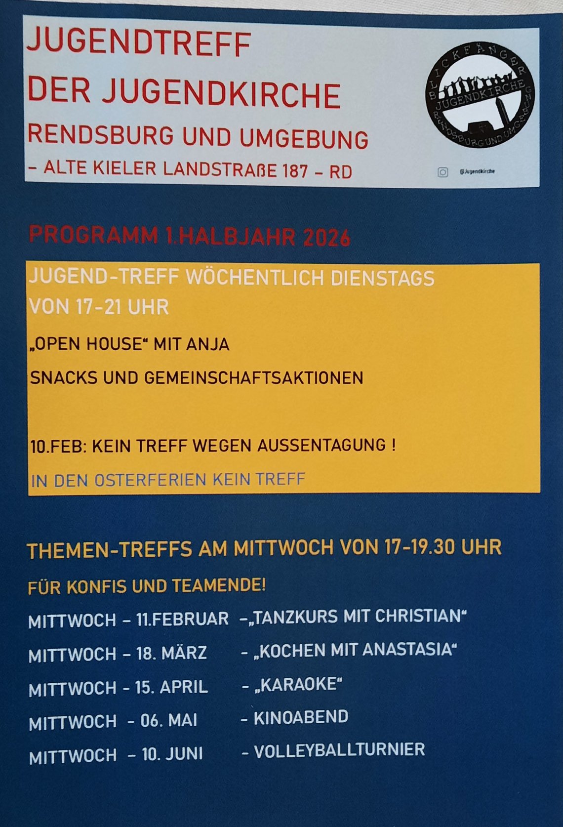 Wir laden alle Jugendlichen ab 13 Jahren herzlich ein, montags von 18:00 Uhr bis 20:30 Uhr im Jugendtreff im Gemeindehaus Ascheffel, Mühlenweg 1 und zum YoungTeam donnerstags von 18-20 Uhr im Gemeindehaus in Owschlag, Kirchenweg 5 mit uns zusammenzukommen.