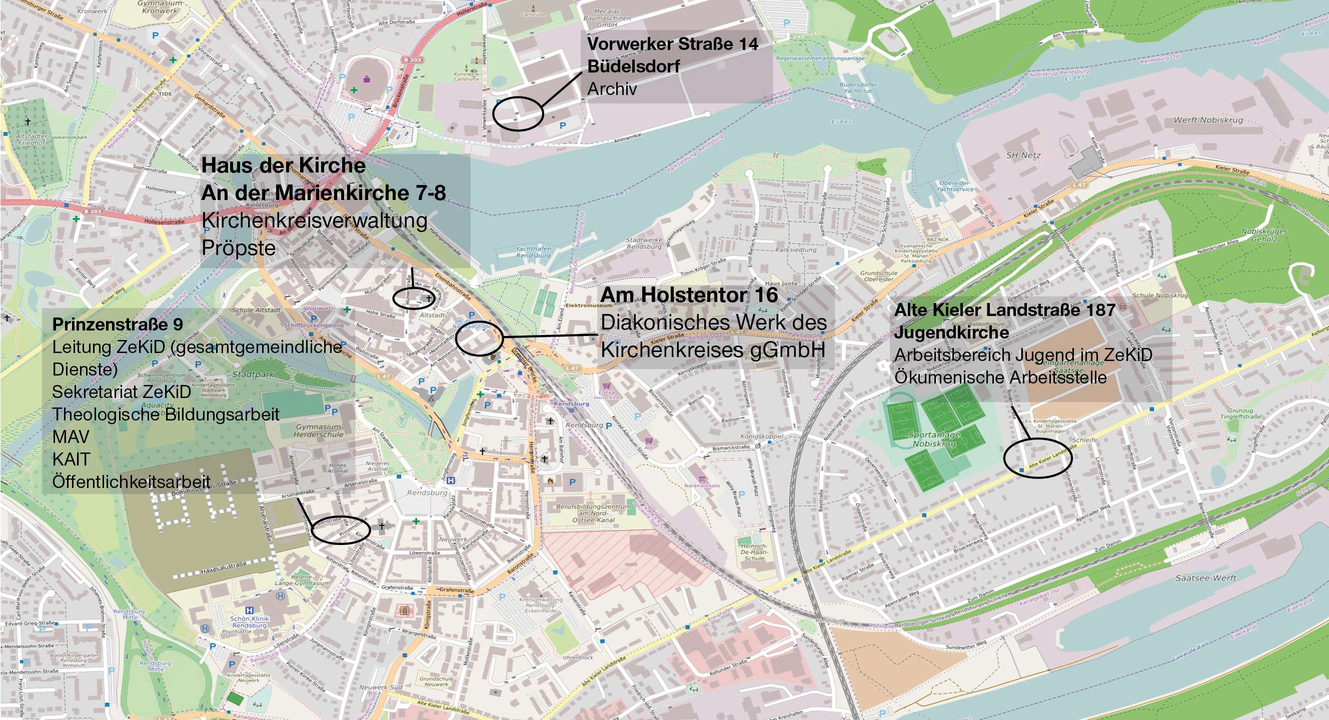 Die Kirchenkreisverwaltung befindet sich im Haus der Kirche an St. Marien. Das Haus der Kirche grenzt an 2 Straßen und hat deshalb 2 Adressen: An der Marienkirche 7-8 und Mühlenstr. 27-29. Es liegt in der Innenstadt (Altstadt) von Rendsburg, direkt an der St. Marienkirche. Das Haus der Kirche ist vom Bahnhof Rendsburg ca. 10 Gehminuten entfernt.
